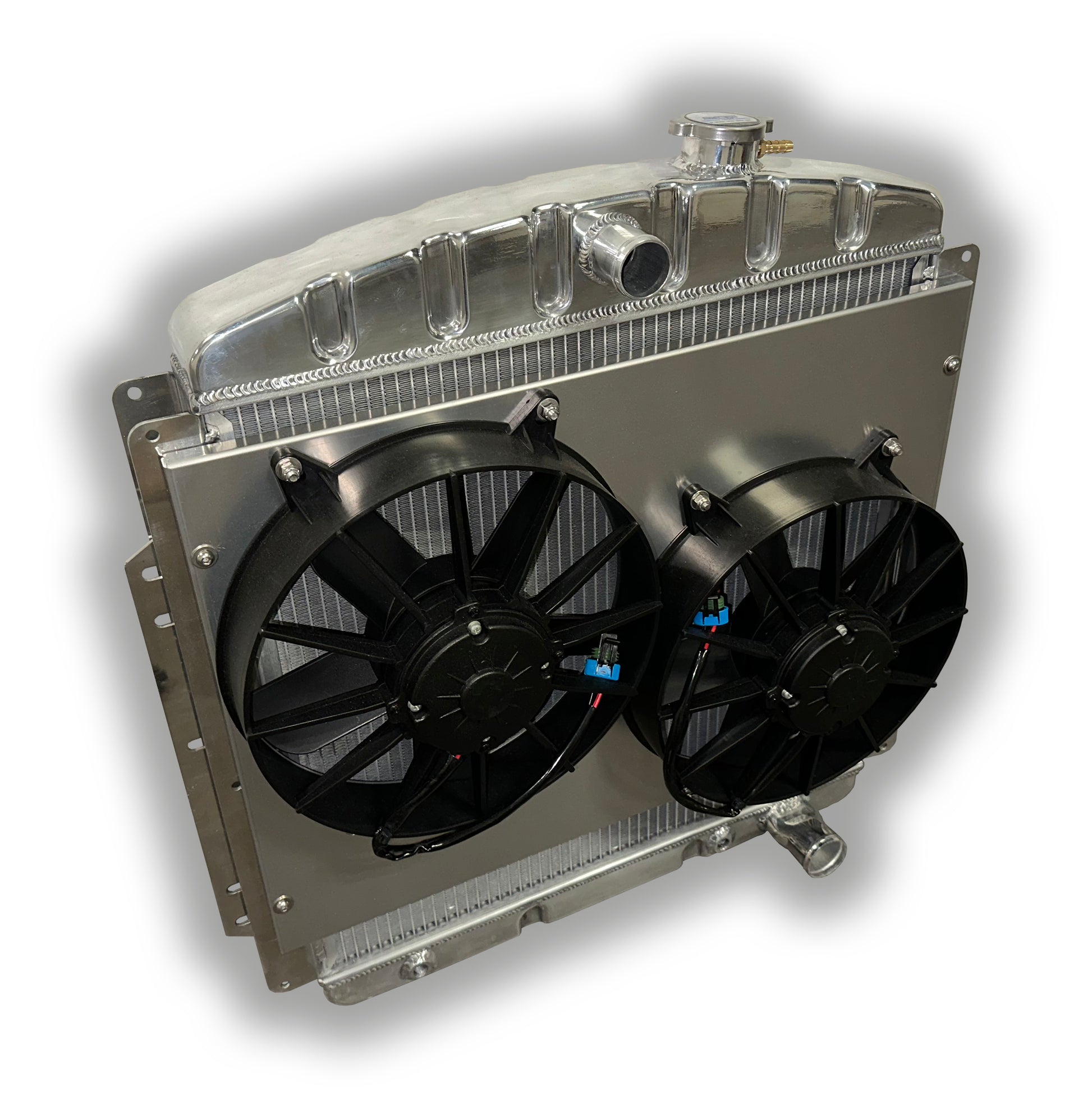 This radiator setup is ready to drop in with our aluminum shroud and dual 11" HD fans delivering a real combined 3000 CFM. It's completely assembled and ready to drop into your truck project. We don't use WIMPY fans that belong on Playskool cars.