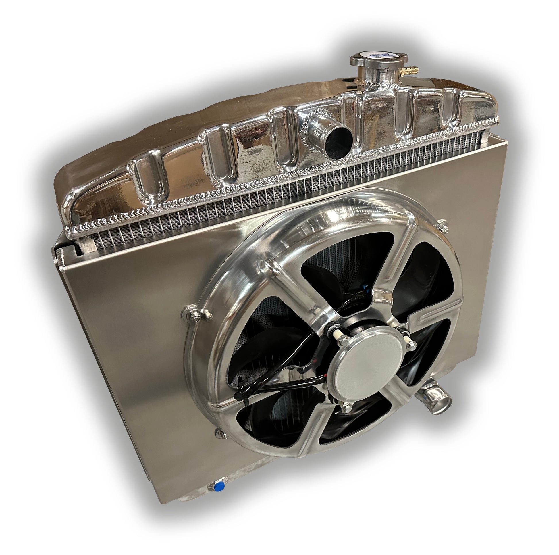 This is our all new aluminum radiator for the 55 - 56 Chevy's for the 6 cylinder mounting position with high powered 16" high powered fan and shroud kit. Please see our part number 1427 for the V8 mounting position. It looks great and cool greats while giving your ride style.
