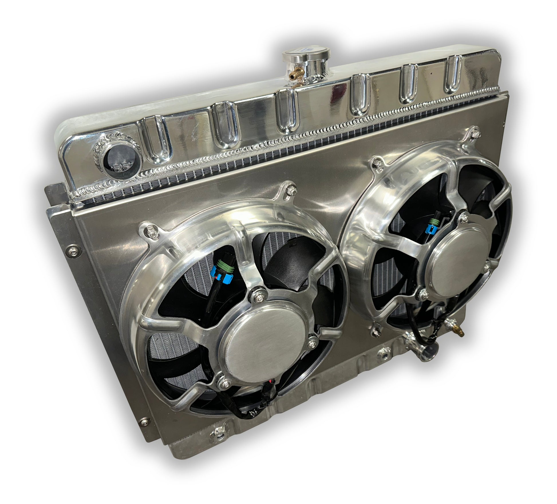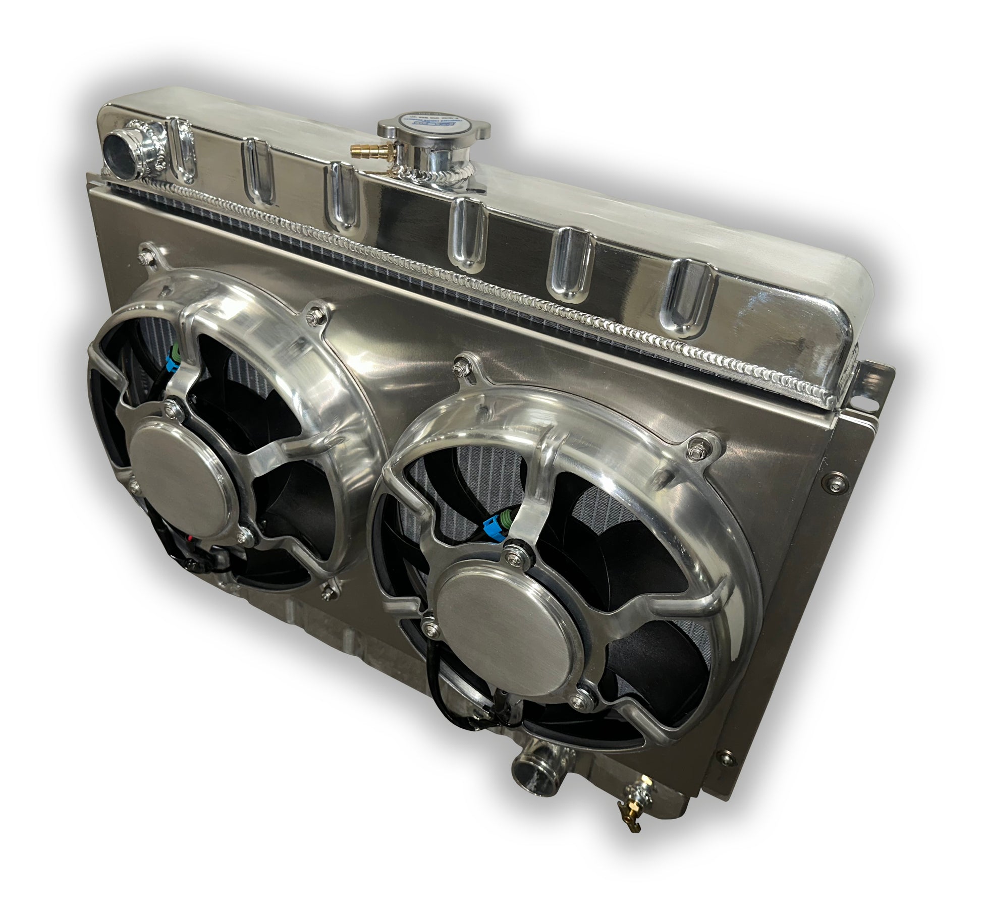 The radiators are not polished and have a natural finish. For photos, the radiators have been removed from the packaging and cleaned with an aluminum cleaner and scotch brite. Fan relays and control is not included.