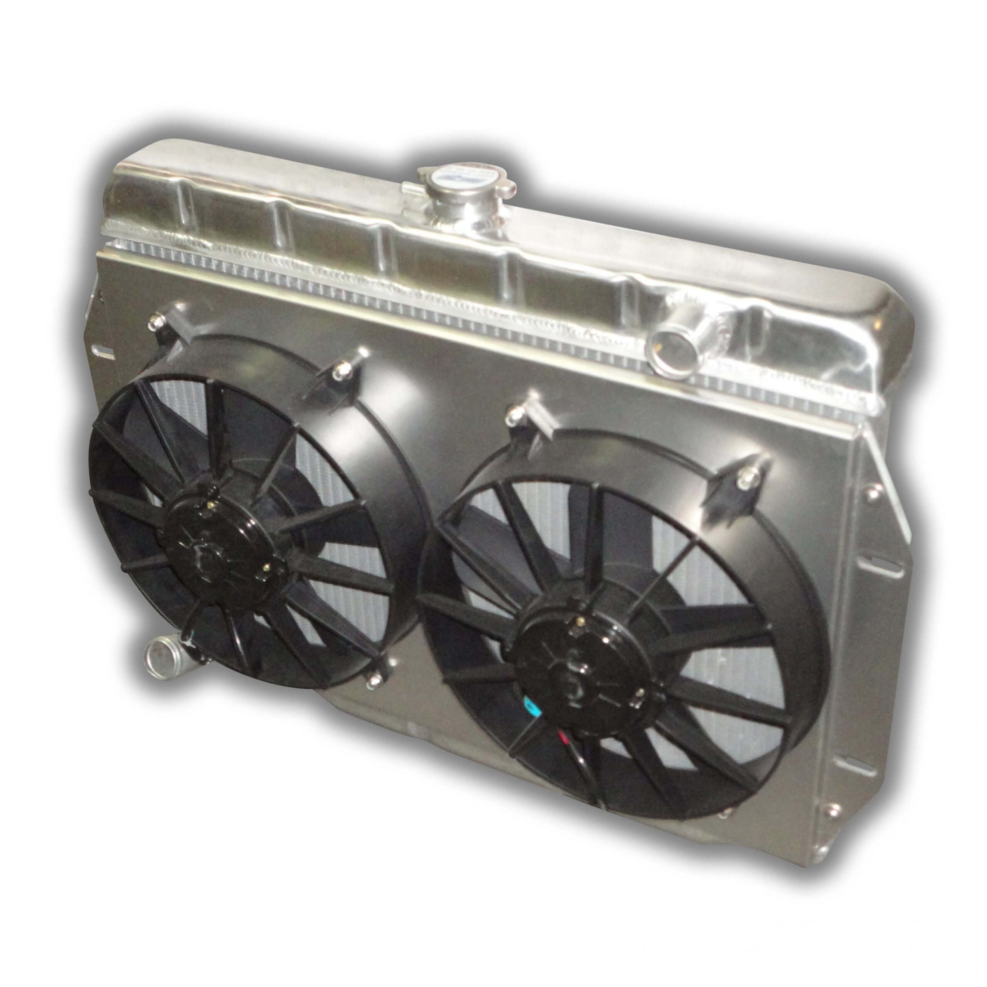 - DUAL 3000 CFM FANS with aluminum shroud. Killer cooling without rainbows, unicorns or 9000 imaginary CFM gimmick fans. Please check your clearance before ordering. You will need 7" of clearance from the water pump tip to the core support.